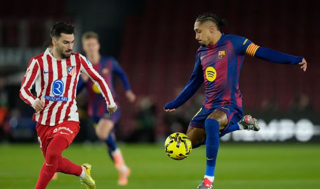 第20分钟,莫利纳送出过顶传球,巴埃纳单刀推射破门,帮助马竞1-0领先,随后第25分钟,佩德里送出直塞助攻,拉菲尼亚晃过门将后推射得手,帮助巴萨1-1快速扳平。第36分钟,巴里奥斯禁区内绊倒了奥尔莫,巴萨获得点球,随后莱万主罚打高了,上半场比分还是1-1平。